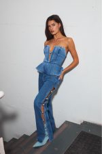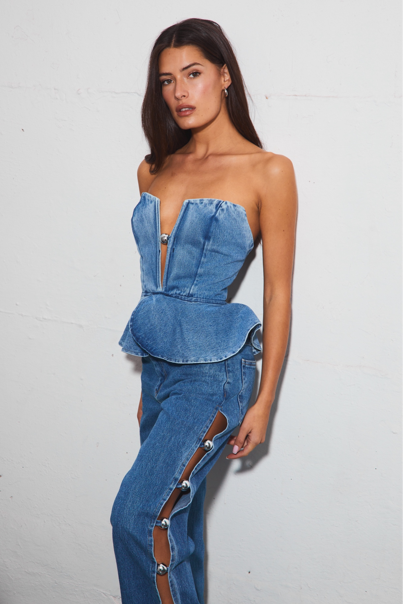 בדי גינס איכותיים שעברו שטיפה ושפשוף מיוחדים, חיתוך בלייזר ושילוב חרוזי כדורים. הכל בעבודת יד.