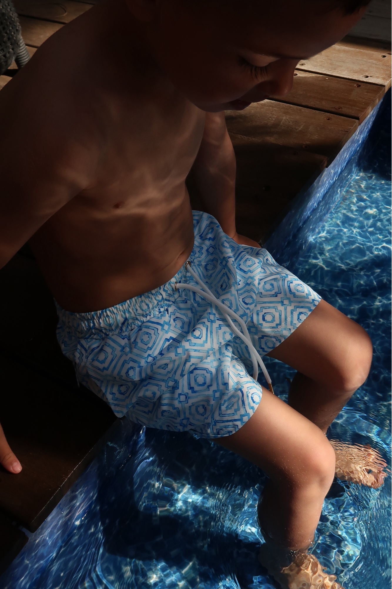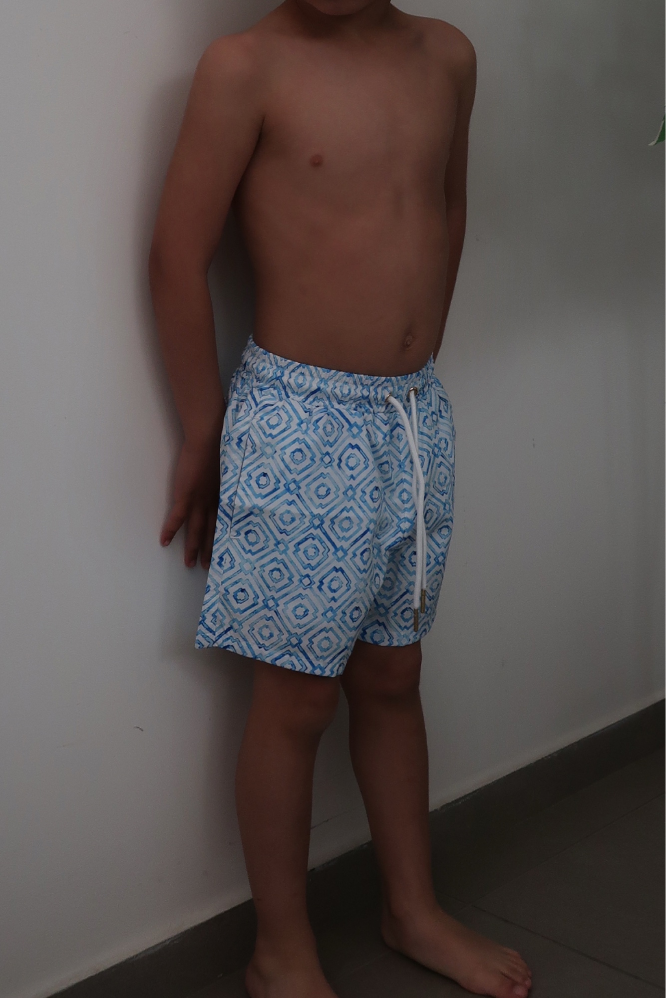 בגד ים ניילון איכותי לילדים בהדפס קייצי תואם לקולקציית סנטוריני